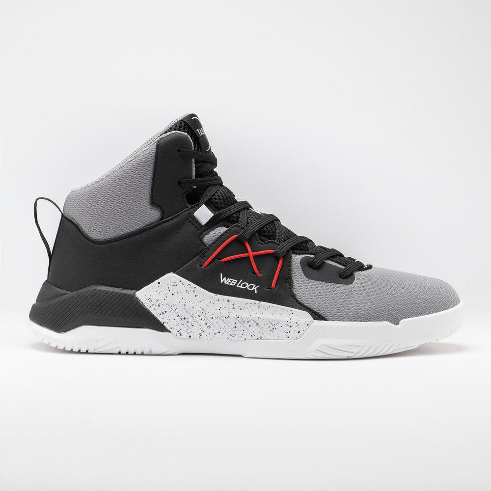 Cette chaussure de basket à tige haute vous offrira un bon maintien de la cheville. Elle est composée d'une mousse injectée au talon pour amortir les impacts après chaque saut. La semelle extérieur en caoutchouc est adhérente, résistante à l'abrasion et non marquante, vous pourrez jouer avec à l'intérieur comme à l’extérieur.