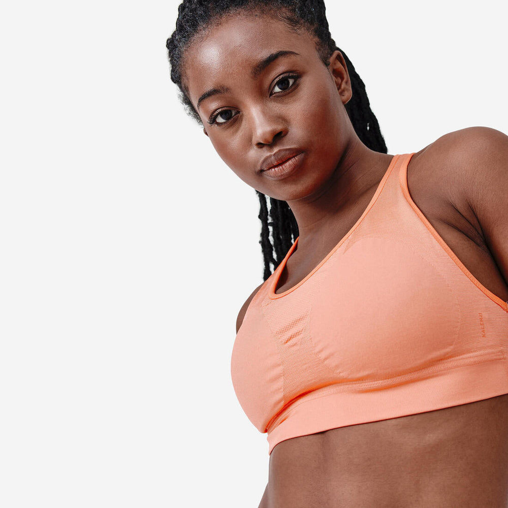 Brassière de running sans coque et respirante, créée sans couture. Le maintien est adapté aux chocs répétés de la course à pied.