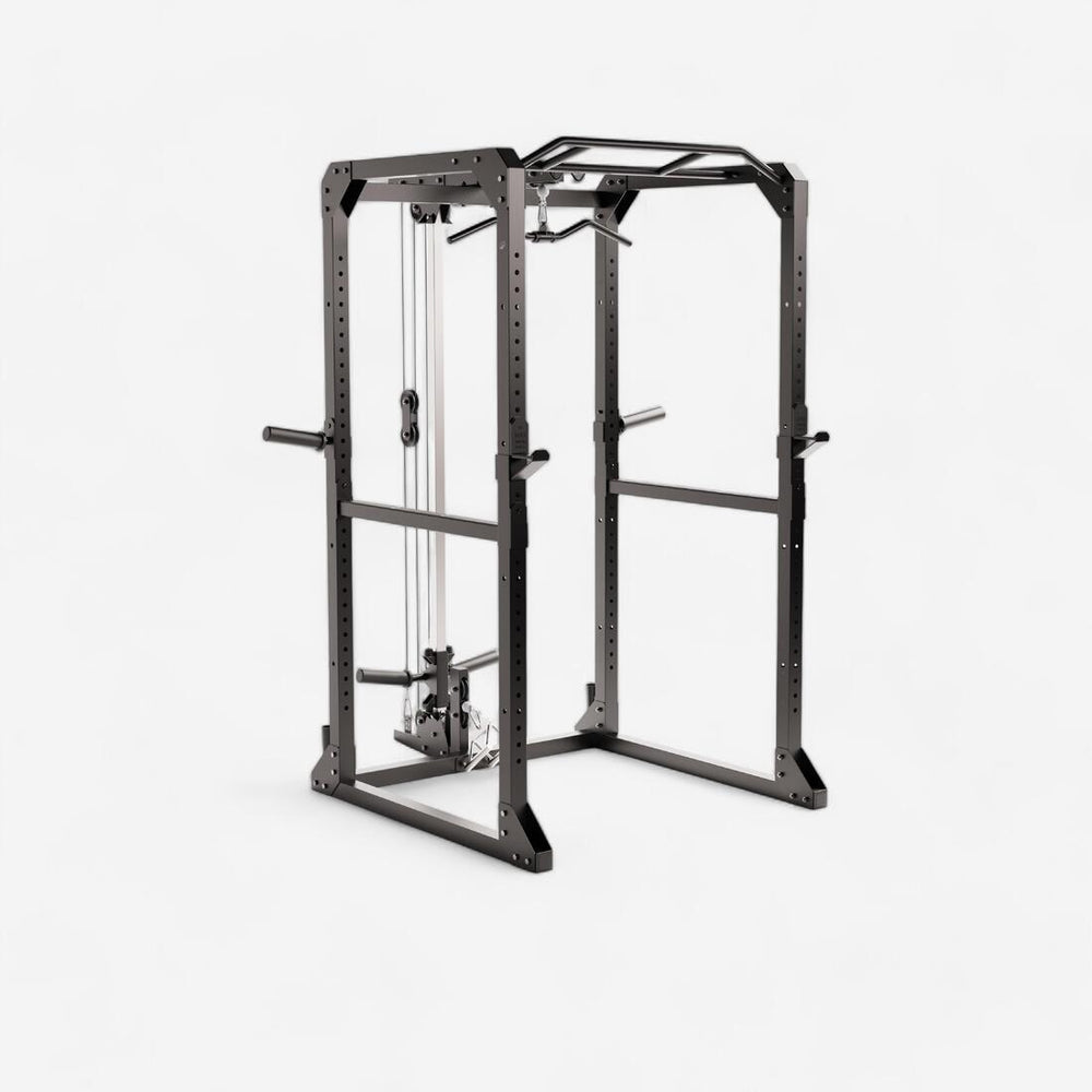 Retrouvez sur cette cage : - Une poulie intégrée non amovible (100 kg max, position basse ou haute) - 2 poignets de tirage (1 triangle et 1 barre) - 2 porte-poids (max 100 kg chacun) et 2 range-barres, pour que votre espace musculation soit facile à ranger. - Un manchon adaptateur afin d'adapter les porte-poids et le range-barre au diamètre de votre matériel : 28 mm ou 50 mm. - Et la barre de traction peut s'installer de deux façons pour vous proposer une prise élargie.